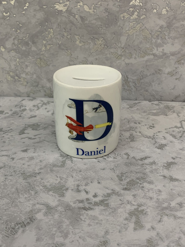 Ceramic money box with aeroplanes printed onto it.