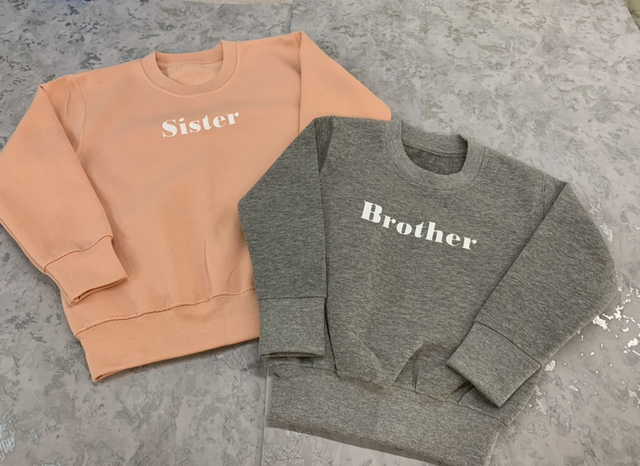 This sweatshirt will come with either brother or sister added to the front in white or black. Please state which name and colour text you would like when ordering.
