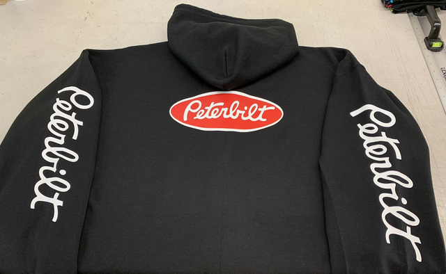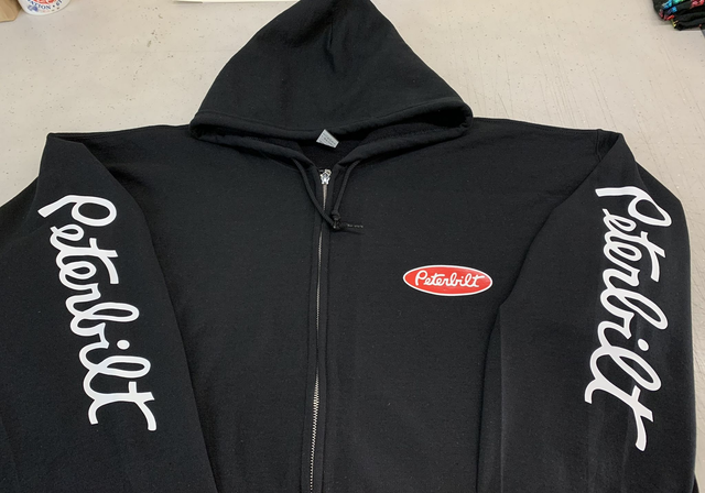 Black zipped hoodie with Peterbuilt details added to the front back and sleeves in white and red vinyl