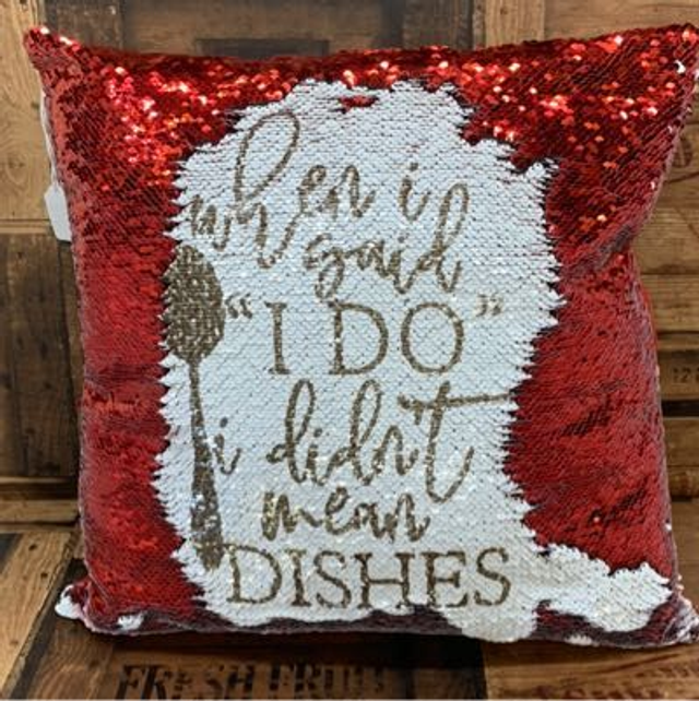 Red sequin cushion with quote