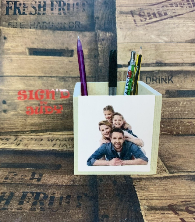 This wooden pencil pot comes with a panel that i can add a photo to.
